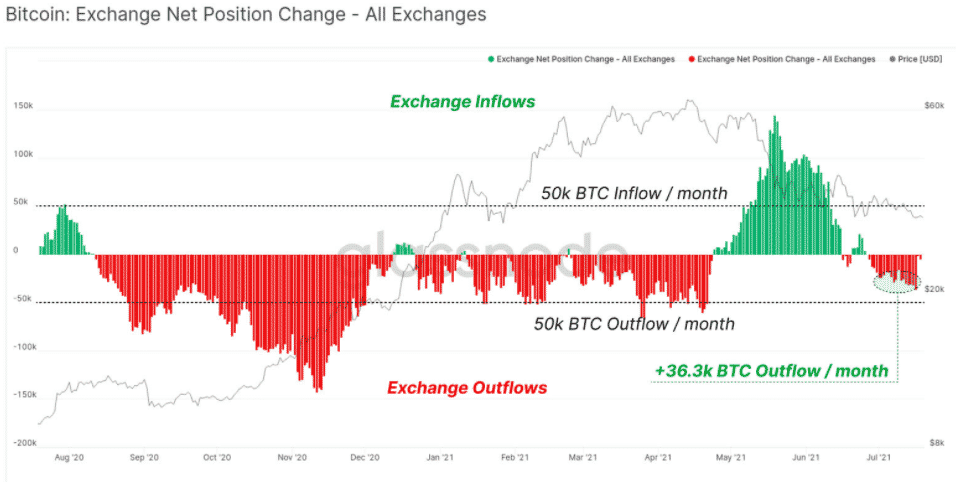 Podľa správy Glassnode z 19. júla „The Week On-Chain” sa bitcoinové rezervy centralizovaných búrz naďalej znižovali aj napriek nedávno pretrvávajúcej medvedej dynamike. Z búrz sa mesačne vyberalo priemerne 36 000 BTC (v hodnote zhruba 1 miliardy dolárov).
