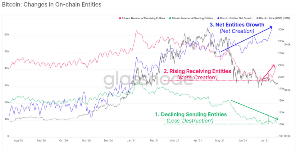 Glassnode tiež identifikoval nedávny nárast počtu subjektov držiacich Bitcoin od mája, keď sa zvýšil zo zhruba 250 000 na takmer 300 000. Glassnode popisuje „subjekt” ako jedinečný klaster združených adries v reťazci.
