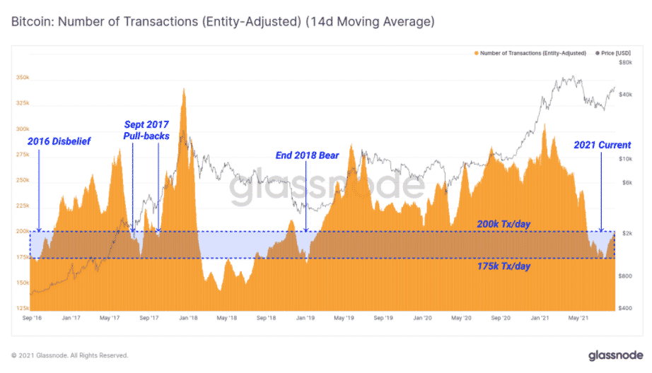 Počet bitcoinových transakcií bol taký nízky iba niekoľkokrát za posledných päť rokov. Vyskytol sa počas býčieho trendu v rokoch 2016 – 2017, keď Bitcoin prvýkrát dosiahol 20 000 dolárov. Rovnaká úroveň bola zaznamenaná aj na medveďom trhu v rokoch 2018 – 2019, keď sa cena BTC prudko znížila o 85 % z vtedajšieho maxima.