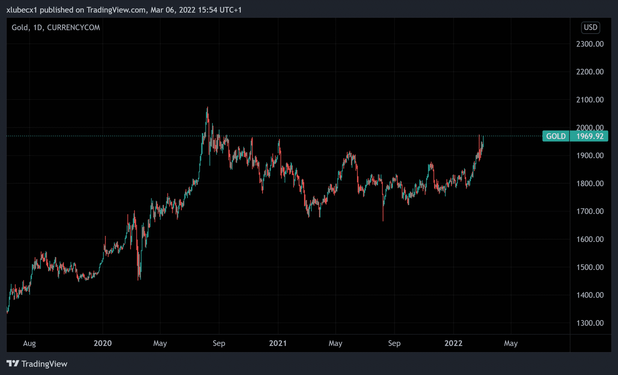 Vojna na Ukrajine vplýva rôzne na svetové aktíva. Zatiaľ čo akcie a hlavne najväčšie svetové indexy SPX500 a US100 klesajú, Bitcoin a komodity sú skôr v bullish nálade. Zlato je aktuálne iba 30 dolárov pod magickou hranicou 2 000 dolárov za jednu uncu. Nemá ďaleko k pokoreniu historického maxima.
