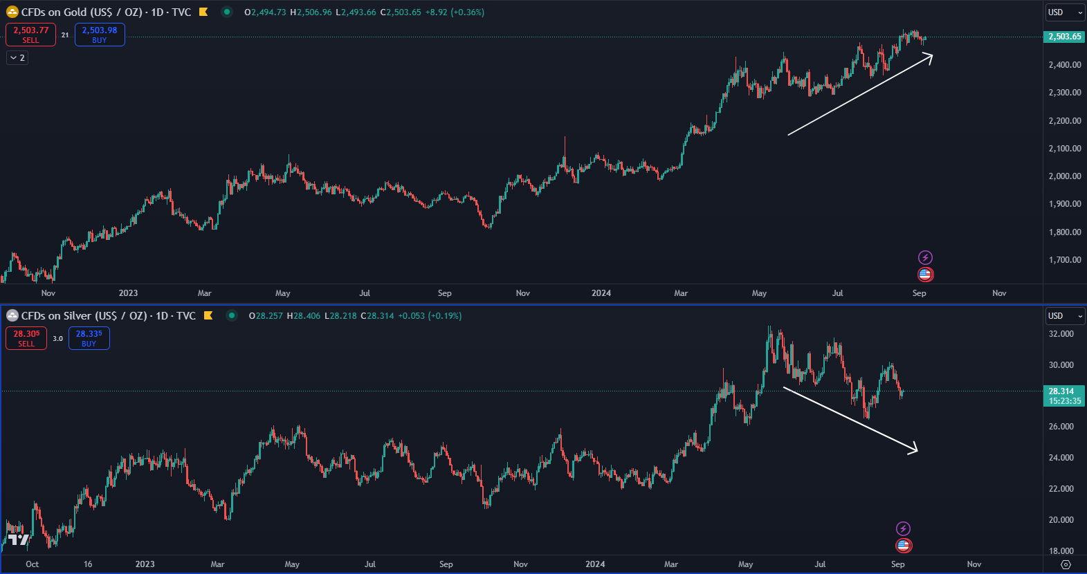 Pri analýze cenového vývoja zlata a striebra narážame na zaujímavé správanie počas posledných týždňov. Od polovice mája cena zlata pokračovala v prekonávaní historického maxima, zatiaľ čo striebro v tomto období výrazne kleslo. A tu zrejme dostávame odpoveď na otázku, prečo zlato rastie a iné svetové aktíva nie.