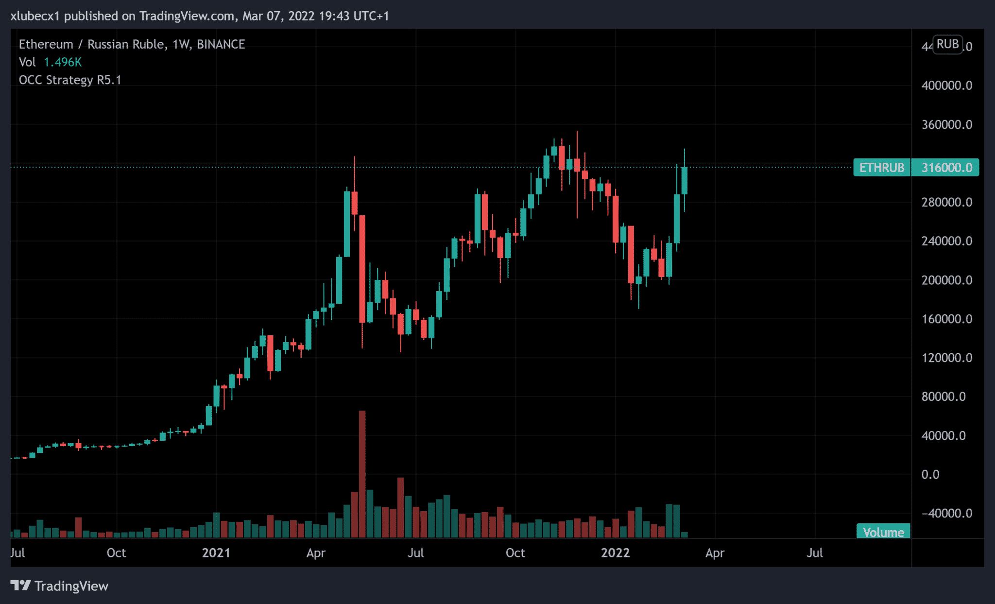 Druhá najväčšia kryptomena zaznamenala už 3. týždeň po sebe bullish náladu. Cena sa v súčasnosti obchoduje približne na hodnote 315 000 rubľov a je iba 10 % od historického maxima.