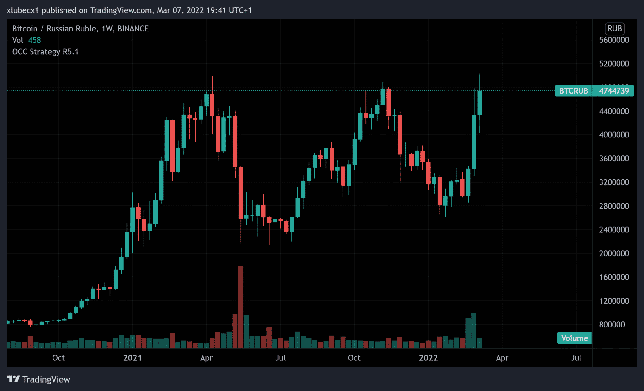 Zdá sa to možno ako nereálne, ale v Rusku je Bitcoin na historickom maxime. Cena po prvýkrát prekonala hranicu 5 miliónov rubľov za jeden kus. Podarilo sa tak zlomiť o niekoľko percent historické maximum z apríla 2021. Občania Ruska v dôsledku sankcií hľadajú alternatívne možnosti, ako si uchovať hodnotu svojho majetku. Naznačujú to aj nákupné objemy, ktoré sú rovnako vysoké. Minulý týždeň sa na grafe vytvorila historicky najväčšia nákupná sviečka v celej histórii vývoja (burza Binance).