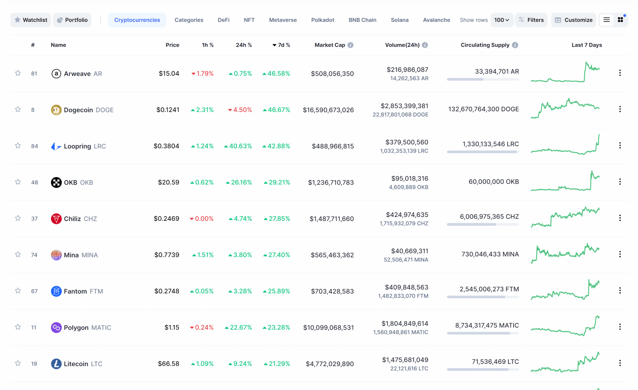 Ďalším skokanom týždňa je kryptomena Arweave, ktorá vyrástla o necelých 50 %, za ňou okrem Dogecoinu nasleduje Loopring s 43 % zhodnotením a OKB s 30 % zhodnotením. Bitcoin je iba v 2 % zisku a nový kapitál, ktorý sa prilial do trhu, smeroval posledné dni prevažne do altcoinov.