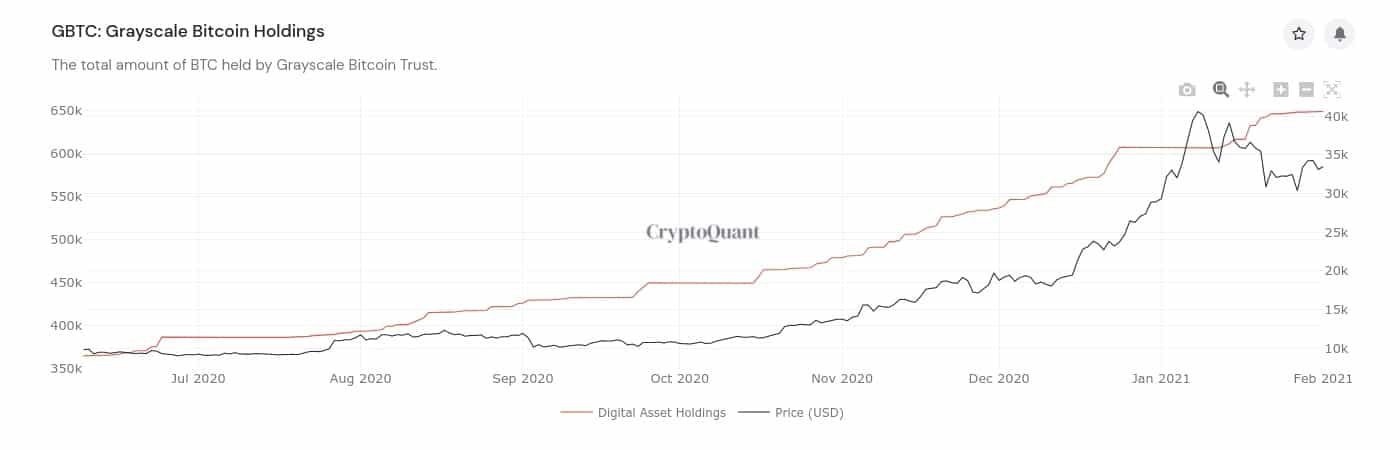 Zajtra (3. februára 2021) opäť dôjde k uvoľneniu akcií Grayscale fondu na burzy (tieto akcie sú kryté kryptomenami) a je veľmi pravdpeodobné, že väčšina obchodníkov peniaze opäť reinvestuje do Bitcoinu. Špekuluje sa, že to opäť rozpúta cenový rast. Celý mechanizmus je podrobne popísaný na webe hackernoon.