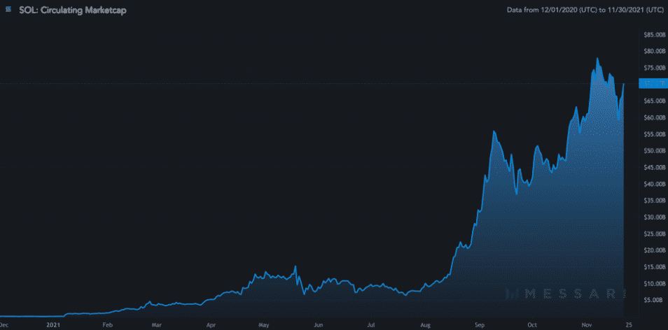 V dôsledku toho cena SOL, ktorá funguje ako poplatok a vkladový token v ekosystéme Solana, medziročne vzrástla o viac ako 10 700 %, pričom jej obežná trhová kapitalizácia dosiahla v novembri vrchol takmer 77,93 miliárd USD.