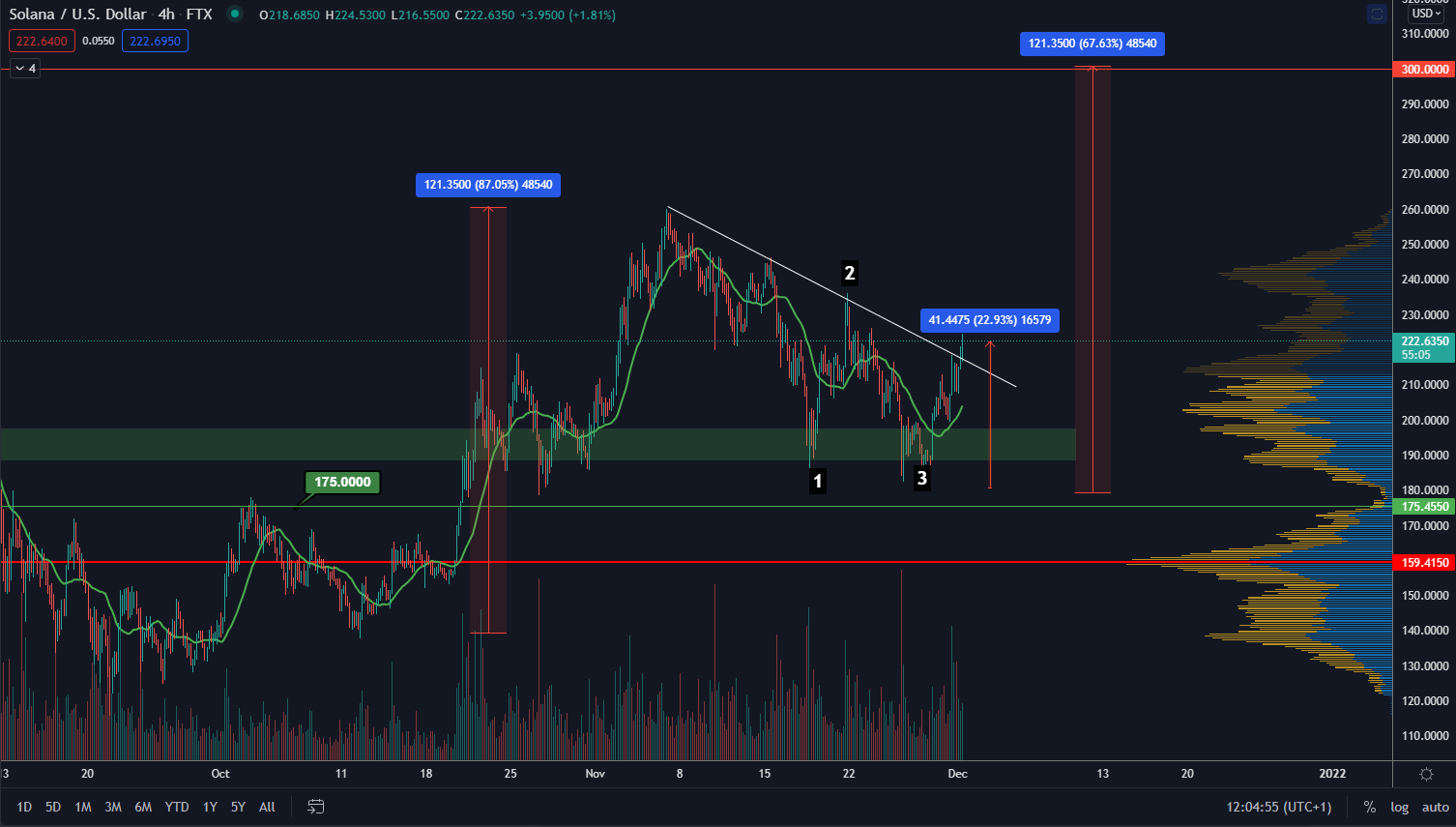 SOL sa nachádza v rastúcom legu, ktorý od minima dosiahol už vyše 23-percentný zisk v čase písania článku. Podľa predĺženia predošlého rastúceho legu vidíme, že ďalšie maximum by mohlo dosiahnuť 300 $.