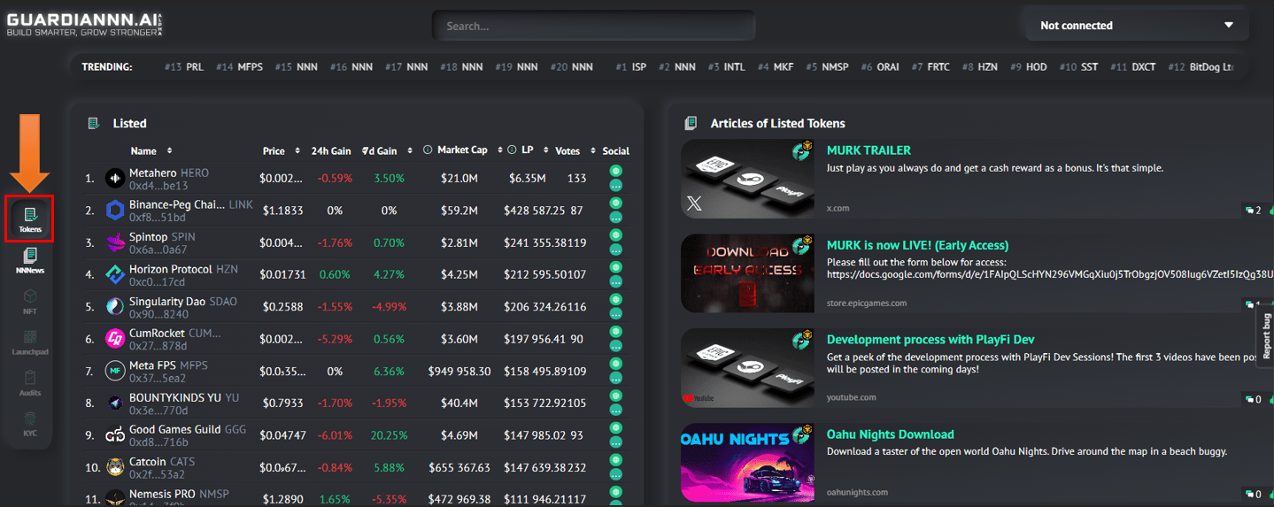Zrejme hlavným dôvodom, prečo sa rozhodnete pre GuardiaNNN.ai, je analýza tokenov. Do tejto sekcie sa dostanete prostredníctvom hlavného menu pod skratkou Tokens. Tieto tokeny si následne viete filtrovať podľa toho, o ktoré je momentálne najväčší záujem, alebo podľa toho, ktoré sú nové.