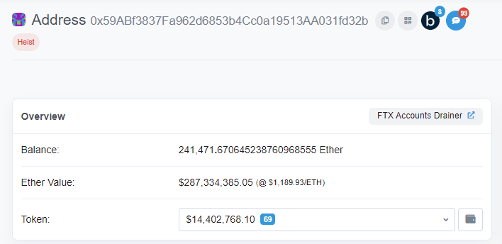 Útočník vykonal viacero swapov a medzisieťových transakcií a len v ethereovej peňaženke obdržal 241 471 ETH v hodnote približne 280 miliónov dolárov pri cenách v čase písania článku podľa Etherscan. Vďaka tomu je účet s názvom FTX Accounts Drainer 35. najväčším držiteľom Etherea z hľadiska počtu držaných ETH.