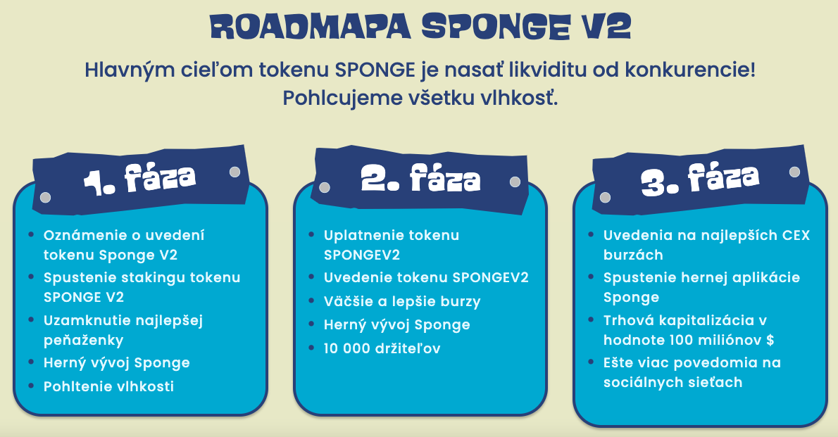 SpongeV2 si kladie za cieľ zopakovať úspechy, ktoré dosiahol s prvým tokenom. Tokenu SpongeV1 sa podarilo získať trhovú kapitalizáciu až vo výške 100 miliónov dolárov. Jeho druhá verzia $SPONGEV2 beží na blockchaine Ethereum, a patrí tak medzi tokeny štandardu ERC-20. Projekt SpongeV2 sľubuje nielen inovácie v technológii, ale aj zvýšenie hodnoty pre svojich držiteľov.