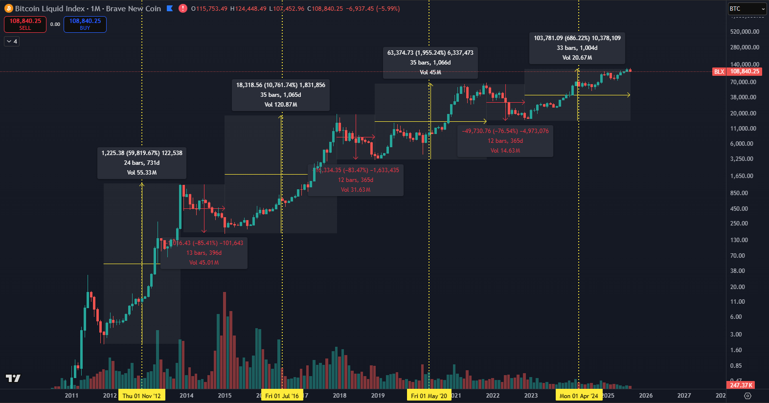 Bitcoin aj napriek neustálym špekuláciám zatiaľ verne kopíruje svoj tradičný 4-ročný cyklus. Od prvého halvingu v roku 2012 sa podľa údajov TradingView opakovane potvrdzuje, že cena začína výraznejšie rásť približne 1 000 dní pred aj po znížení blokovej odmeny. To vytvára typický rytmus rastúceho a klesajúceho trhu.