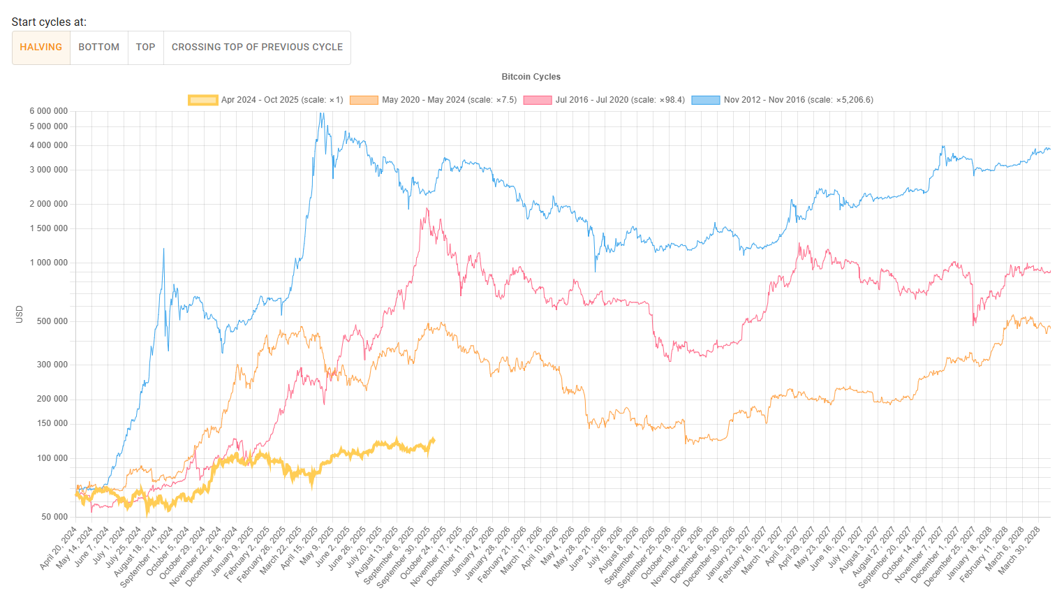 Podľa tohto modelu by mal vrchol aktuálneho cyklu nastať koncom roka 2025, po ktorom by mala nasledovať korekcia minimálne o 70 %, podobne ako v minulosti. Avšak tento scenár sa nemusí zopakovať a Bitcoin možno navždy poruší halvingovú logiku.