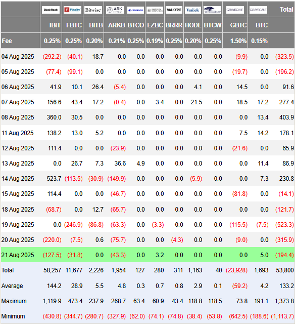 Podľa údajov Farside bitcoinové spotové ETF zaznamenali v posledných dňoch výrazné odlivy kapitálu – 18. augusta 121 miliónov, 19. augusta 523 miliónov, 20. augusta 315 miliónov a 21. augusta 194 miliónov. Napriek tomu pretrváva dlhodobý trend čistého prílevu.
