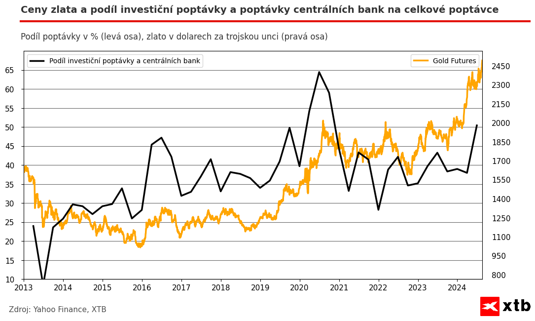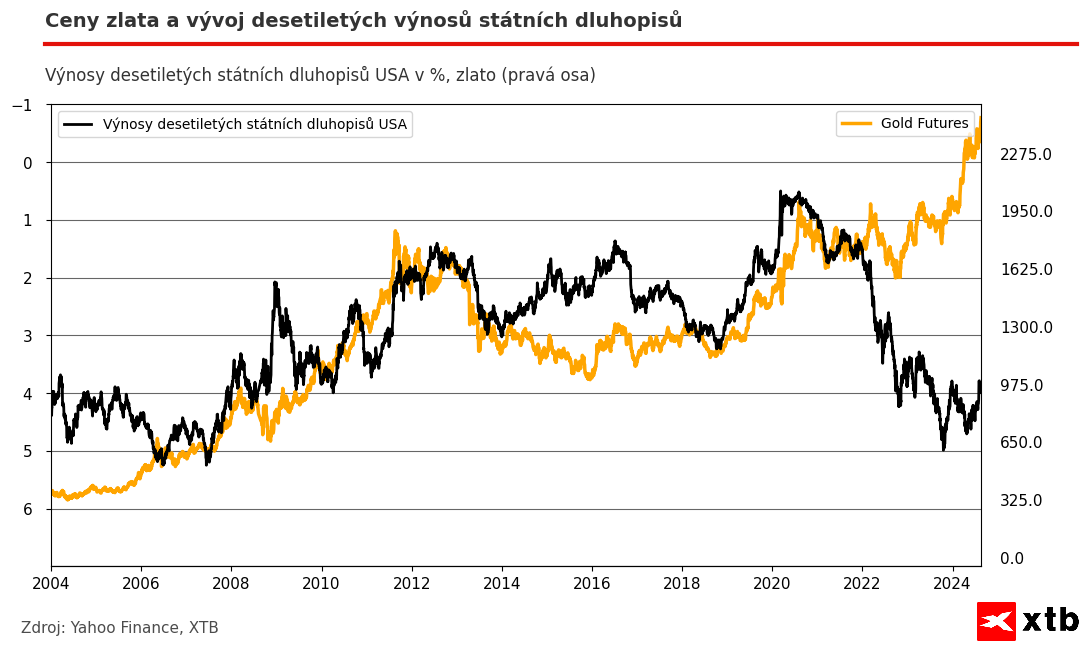 Na prvý pohľad rast ceny zlata nemusí dávať úplne zmysel, faktorov podporujúcich rast ceny totiž nebolo veľa. Negatívny vplyv na cenu mal mať rast úrokových sadzieb od roku 2022, ktorý, ako je obvyklé, zatraktívnil iné relatívne bezrizikové aktívum, a to americké štátne dlhopisy. Hodnota doláru mala na cenu zlata skôr neutrálny vplyv, pretože sa nachádza presne tam, kde sme ju videli na začiatku roka. Napriek tomu ceny zlata naďalej rástli. V poslednej dobe sa tiež drobní investori začali obzerať po rizikovejších aktívach a sťahovať svoj kapitál zo zlatých ETF, čo by malo mať opäť negatívny vplyv na ceny zlata.