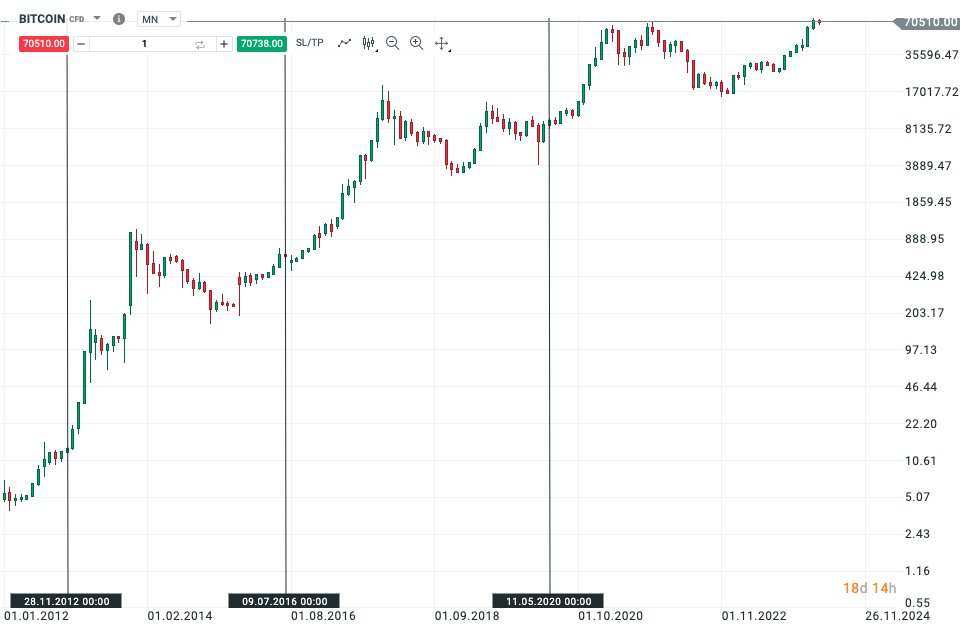 Na grafe vidíte vývoj ceny Bitcoinu od roku 2012 a tri predchádzajúce polenia (halvingy) z rokov 2012, 2016 a 2020 vyznačené zvislými čiernymi čiarami. Skutočnosť, že cena výrazne rástla, však znamená, že v grafe nemôžeme presne vidieť vývoj ceny medzi jednotlivými halvingmi. Na podobné účely je zvykom používať logaritmický graf, ktorý upravuje zvislú os tak, aby bol graf čitateľnejší – rozostupy medzi jednotlivými úrovňami nie sú rovnomerné, ale v čase rastú s tým, ako rastie cena aktíva.