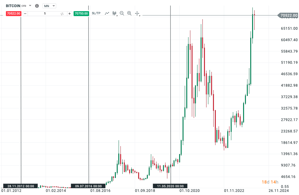 Tento graf vyzerá čitateľnejšie a vidíme, že po každom z predchádzajúcich halvingu Bitcoin rástol, aj keď neskôr došlo k menšej či väčšej korekcii. Počas halvingu v roku 2012 bola cena za 1 Bitcoin približne 12 USD, v roku 2016 približne 680 USD av roku 2020 približne 8600 USD. Vo všetkých predchádzajúcich obdobiach medzi polením teda ceny výrazne rástli, aj keď sa tempo rastu pochopiteľne spomalilo, keď trh rástol.