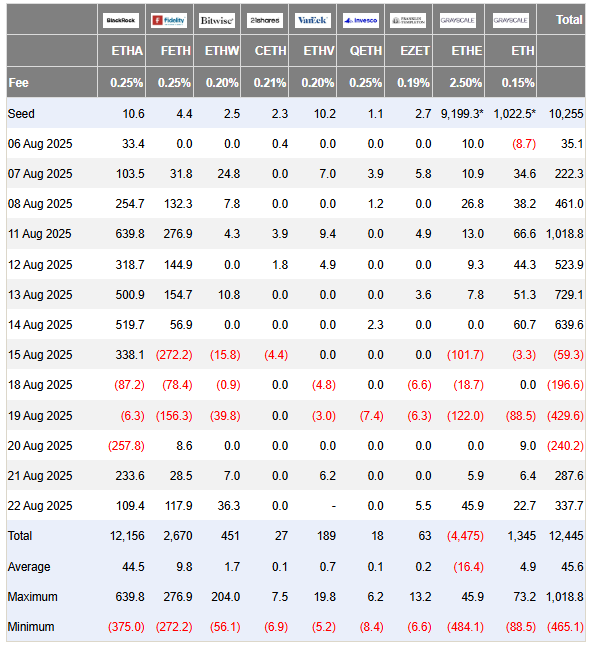 Silným motorom rastu Etherea je aj prílev kapitálu do fondov zameraných na túto kryptomenu. Len 21. augusta zaznamenali ETH fondy prílev viac než 287 miliónov dolárov po sérii odlivov. Aktíva spravované v rámci ETF dosiahli hodnotu 12,12 miliardy dolárov, čo poukazuje na narastajúci záujem investorov.