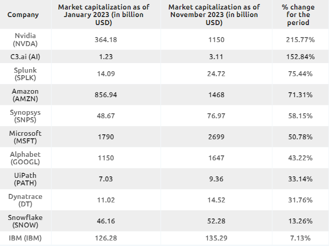 Medzi AI firmy s najvyšším percentuálnym rastom trhovej kapitalizácie patrí Nvidia (215,77 %), C3.ai (152,84 %), Splunk (75,44 %), Amazon (71,31 %) a Synopsys (58,15 %). Sektor AI je však stále v počiatočnom štádiu a predstavuje obrovský potenciál v akomkoľvek odvetví ako napríklad zdravotníctvo, financie alebo automobilový priemysel.