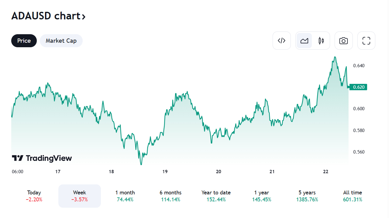 Súčasná dynamika trhu naznačuje, že Cardano by mohlo zažiť 14 % nárast, čo by mohlo jeho cenu posunúť nad úroveň 0,70 dolára. Tento očakávaný prudký nárast je podporený robustným TVL a rastúcim záujmom o ponuky.