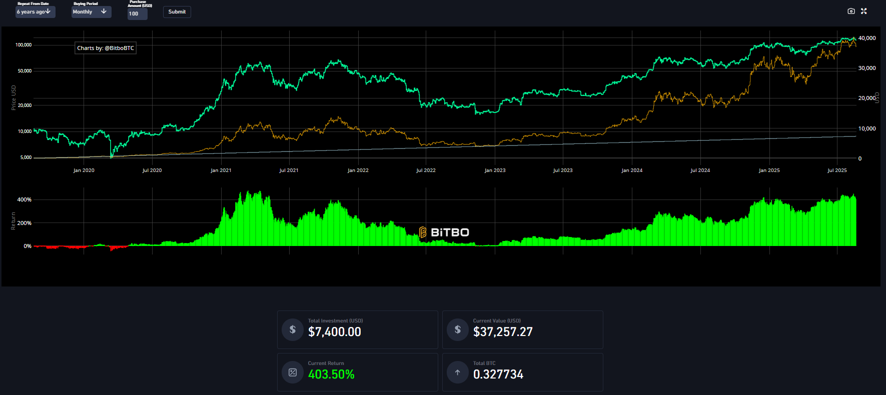 Napríklad, ak by ste investovali do Bitcoinu pravidelne každý mesiac 100 eur od roku 2020, hodnota vášho účtu dosahovala približne 37 257 eur, čo znamená zisk okolo 403,50 %, ukazuje kalkulačka Bitbo.