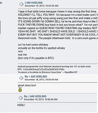 Prvýkrát sa objavil na diskusnom fóre Bitcoin v roku 2013 a prišiel od člena s menom GameKyuubi pod názvom „I AM HODLING“. Takže to bol pôvodne predsa len preklep.