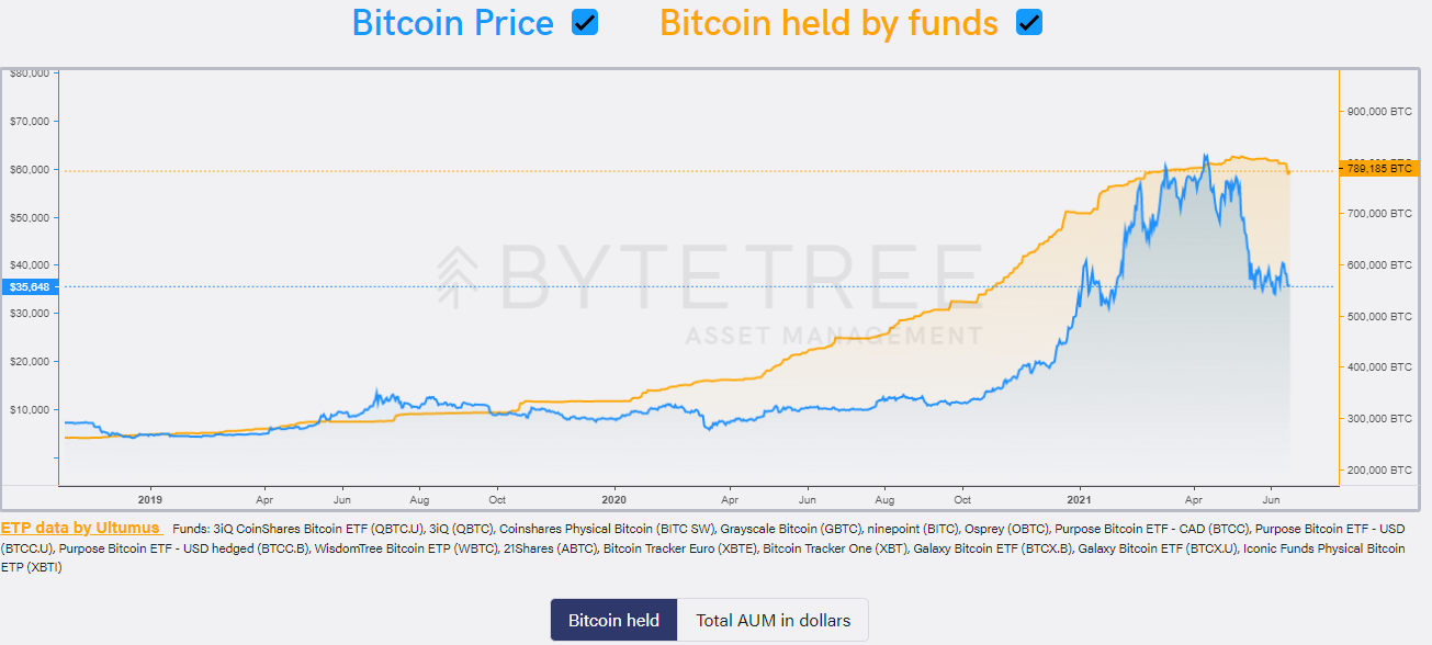 Údaje sledované spoločnosťou ByteTree Asset Management ukazujú, že počet mincí v držbe amerických a kanadských uzavretých fondov a kanadských a európskych fondov obchodovaných na burze (ETF) klesli v piatok na 782 558 BTC (-4,72%) (v hodnote 28,72 miliárd dolárov). Ide o najnižšiu hodnotu od 25. februára.