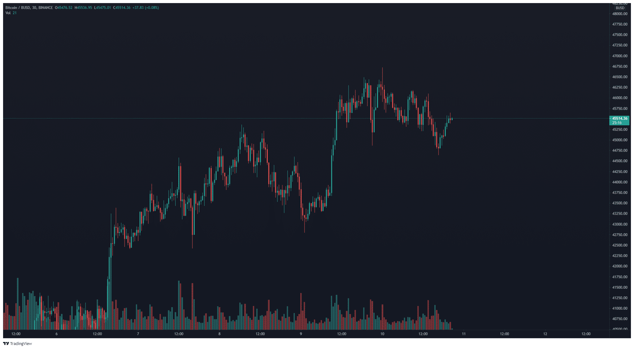 Bitcoin sa pevne chopil šance na dosiahnutie historického maxima. Tento proces sa zatiaľ odohráva bez výraznejších problémov. V utorok sme zaznamenali krátku konsolidáciu, po ktorej sa Bitcoin vrátil nad úroveň 46 000 USD, ale následne po správach o hackerskom útoku prišiel mierny prepad. V čase písania tohto článku sa BTC pohyboval na cene približne 45 500 USD.