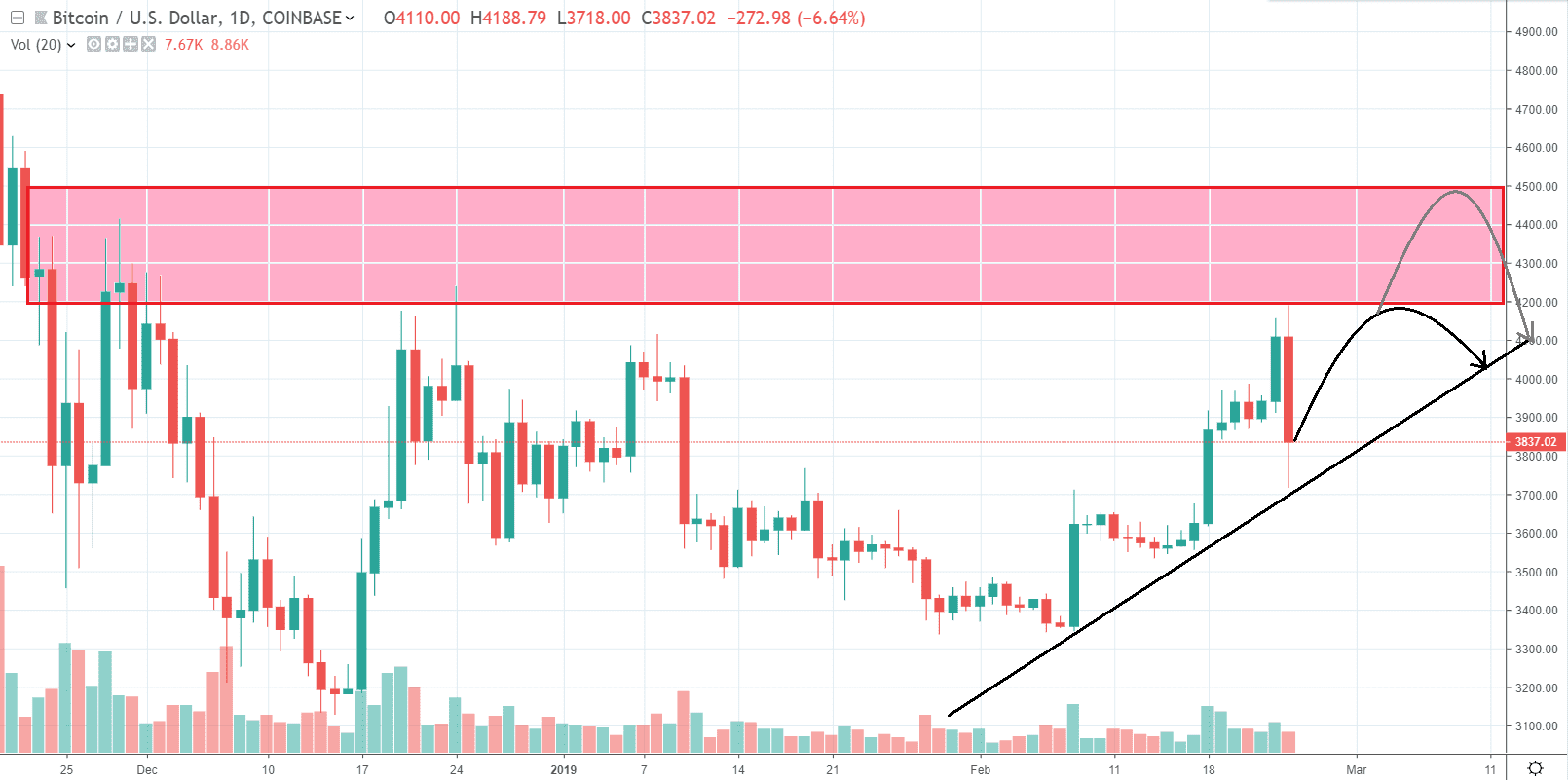Bitcoin po vstupe do tejto oblasti zlyhal hneď niekoľkokrát. Je teda veľká šanca, ze právu tu sa zlomí väz krehkému daily uptrendu, ktorý sa vytvoril na grafe BTC/USD.