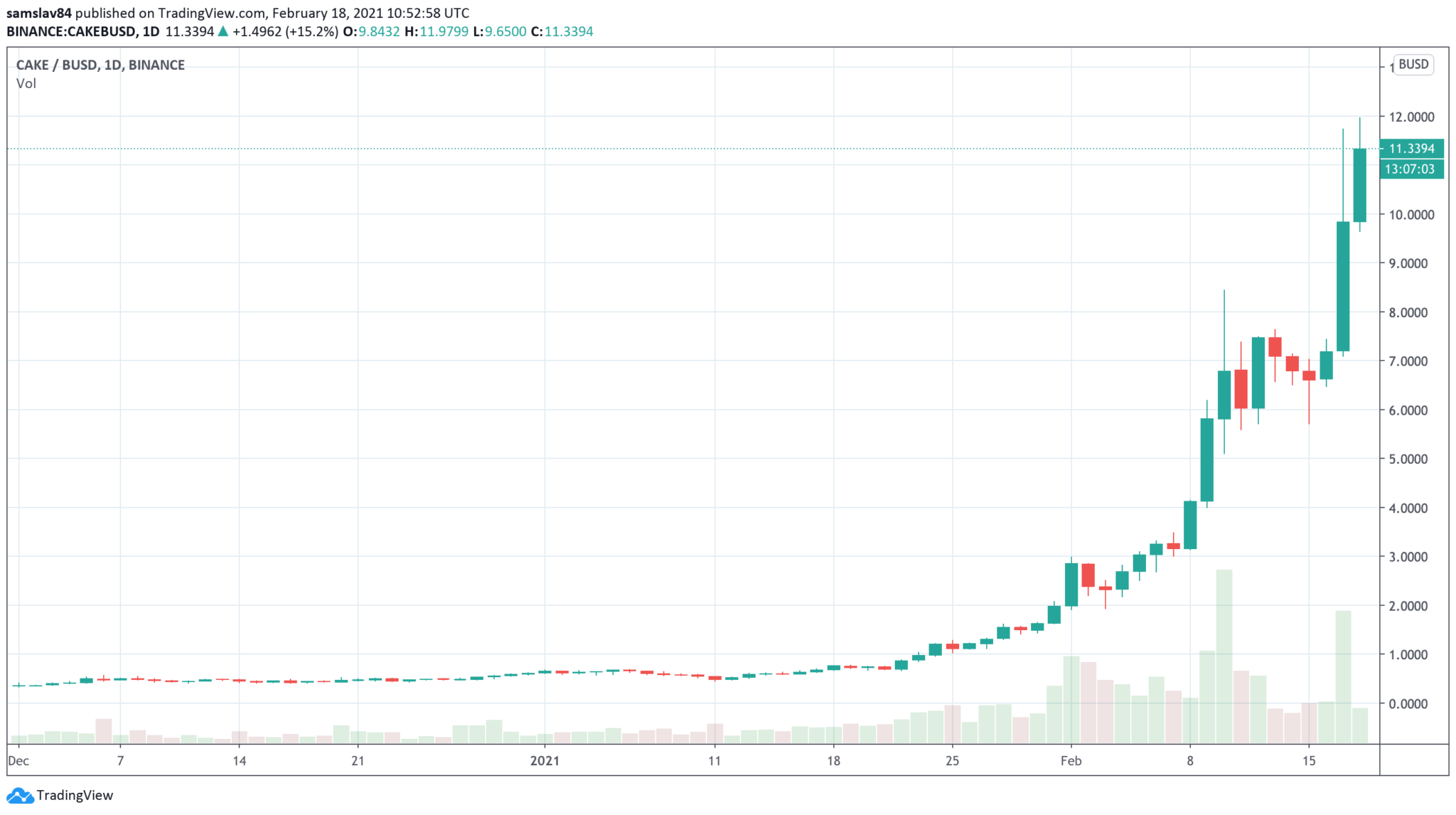 CAKE sa ešte v decembri 2020 obchodoval za miniatúrnych 30 centov a dnes dosiahol hodnotu 12 dolárov. To je rast o 4000% za dva a pol mesiaca!