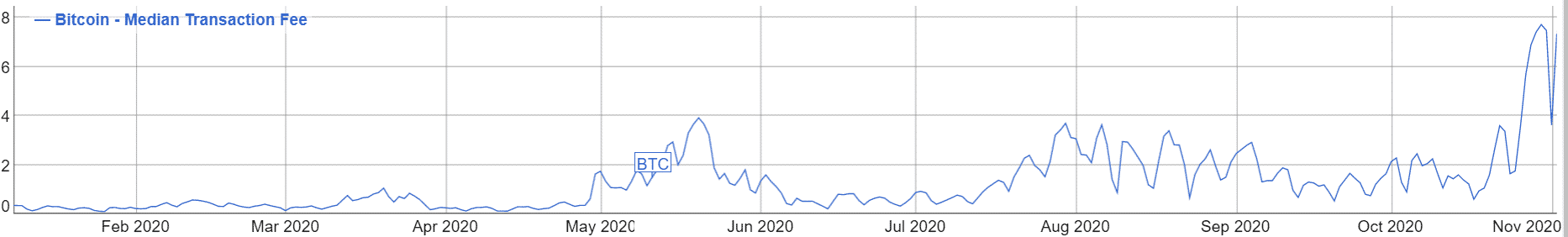 Medián poplatkov za Bitcoin transakciu v roku 2020 – Zdroj: bitinfocharts.com