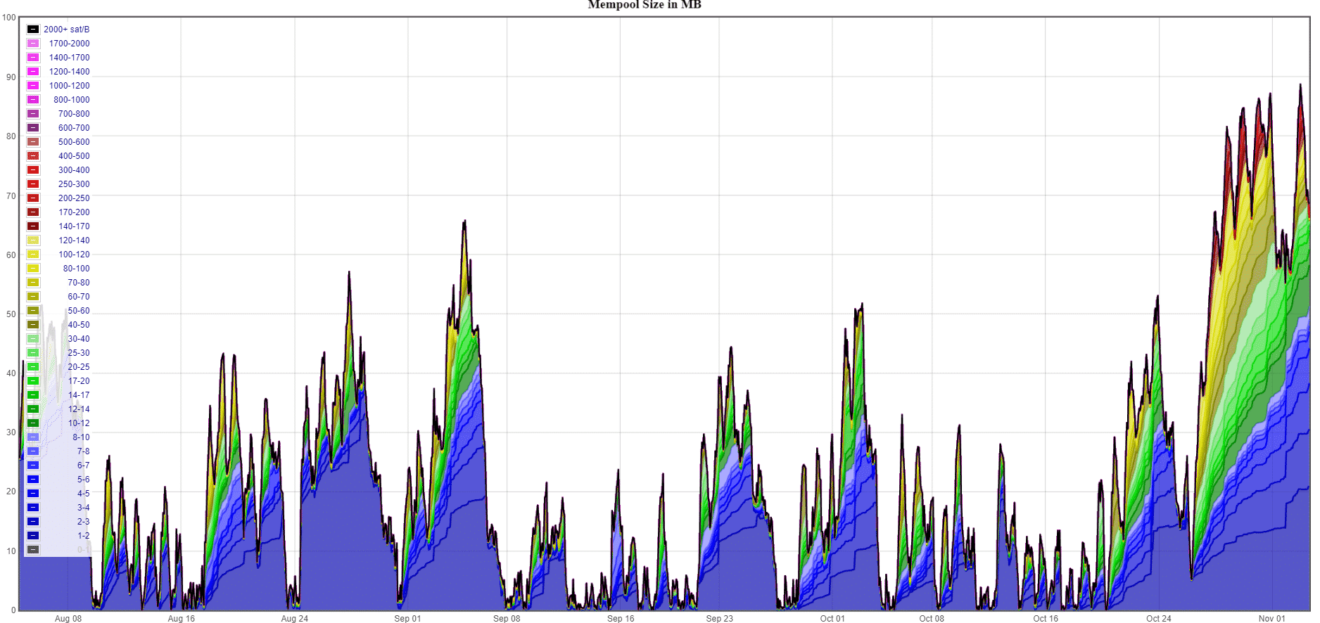 Veľkosť Bitcoin mempoolu v MB – Zdroj: jochen-hoenicke.de