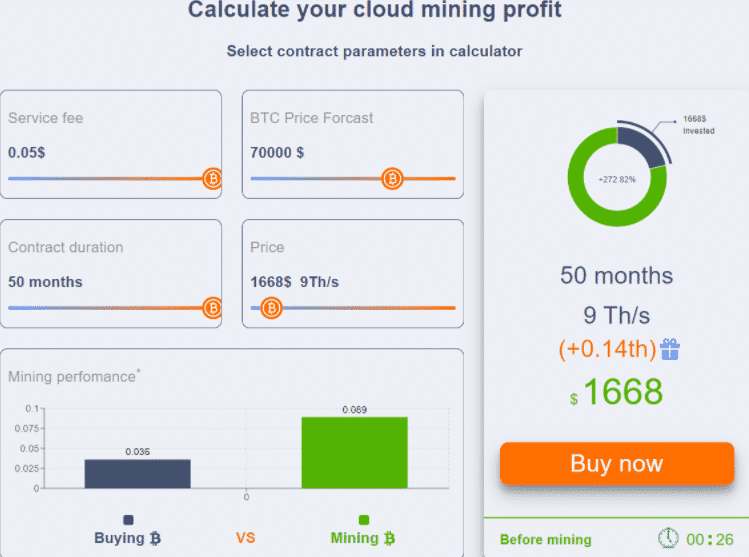 Ako môžete vidieť na grafe, tak 50-mesačná zmluva na 9 terachov za sekundu v súčasnosti stojí približne 1 668 USD. Pri cene BTC 70 000 USD sa predpokladá jeho ziskovosť na úrovni 272,82 %.