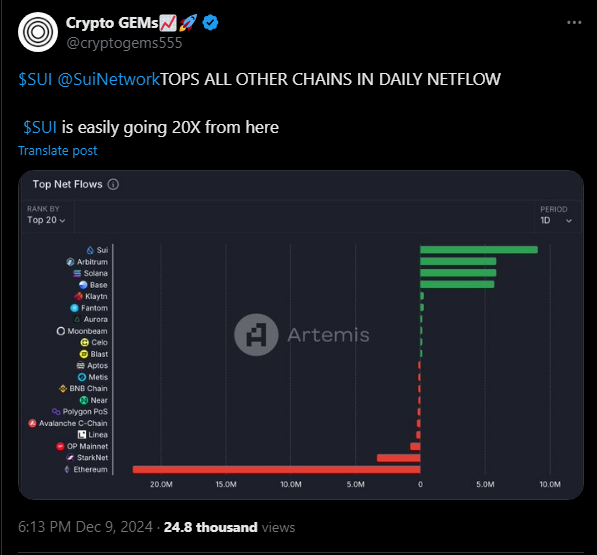 Sui nedávno dosiahlo najvyšší denný čistý prílev spomedzi všetkých blockchainov, keď zaznamenalo 23,8 milióna dolárov za jeden deň. To znamená, že do ekosystému Sui priteká veľa finančných prostriedkov. Táto významná aktivita zdôrazňuje rastúcu dôveru v token Sui a ukazuje, že tejto platforme venuje pozornosť čoraz viac ľudí. Prekonanie sietí ako Solana a Ethereum nie je malý úspech, čo robí zo Sui jeden z najsľubnejších projektov.