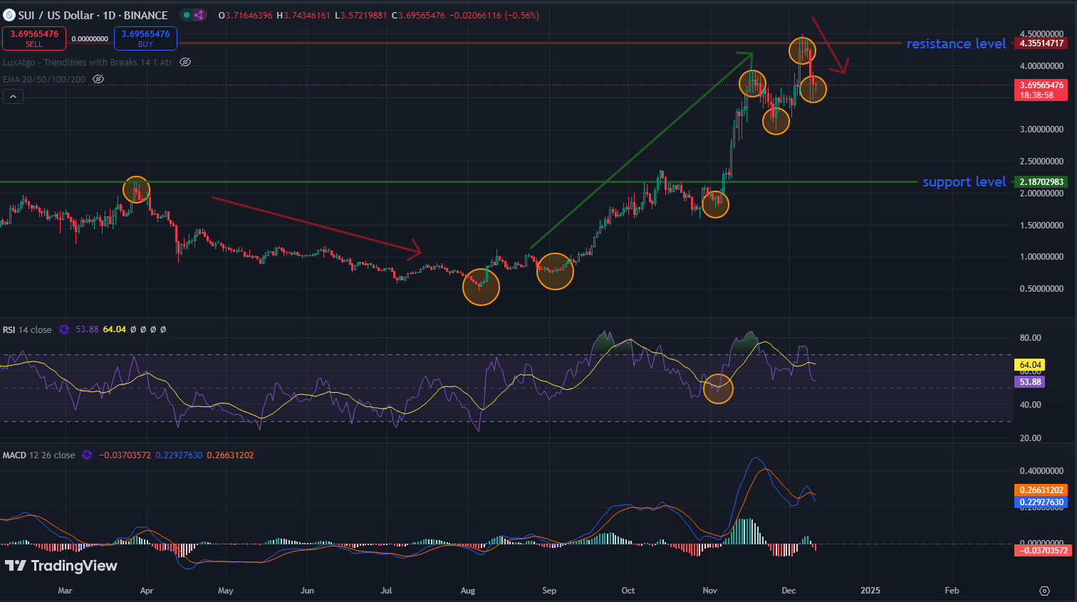 Z technického hľadiska súčasná cena ukazuje potenciál pre rast. Token je na úrovni 3,69 dolára, so 7-dňovou zmenou len 0,1 %. 10-dňový kĺzavý priemer je 3,90 dolára, zatiaľ čo 50-dňový kĺzavý priemer je na úrovni 3,04 dolára, čo ukazuje, že Sui si časom udržal stabilitu. Index relatívnej sily (RSI) je 53,89, čo znamená, že trh nie je ani prepredaný, ani prekúpený. Hodnota MACD 0,229 odráža býčí trend. Prekonanie kľúčových úrovní odporu na 4,35 dolára a 5,23 dolára by mohlo otvoriť cestu k 10 dolárom. Nasledujúce týždne budú kľúčové pre pochopenie predpovede ceny.