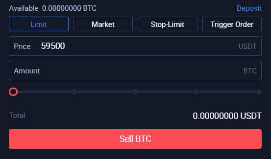Bitcoin sa momentálne obchoduje za 47 870 $. Teraz si však myslíte, že cena pôjde smerom nahor a narazí na rezistenciu 59 500 $. Myslíte si, že táto zóna je rezistentná a cena tu vytvorí lokálne maximum, od ktorého bude následne klesať. Preto zadávate limitný predajný príkaz s cenou 59 500 $. Teraz zvolíte už iba množstvo kryptomeny, ktorú chcete obchodovať.