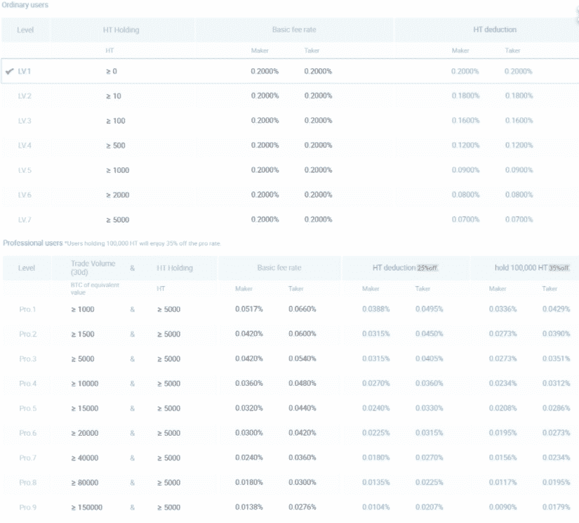Poplatky za obchodovanie – Poplatok za obchodovanie je 0,2 %. Tento poplatok viete ovplyvňovať. Viete ho znížiť napríklad tak, že buď vlastníte určité množstvo Huobi tokenov, alebo podľa zobchodovaného finančného objemu za posledných 30 dní. Aj tu sa obchodné poplatky, tak ako na mnohých iných burzách, rozlišujú podľa toho, či ste tvorca alebo príjemca.