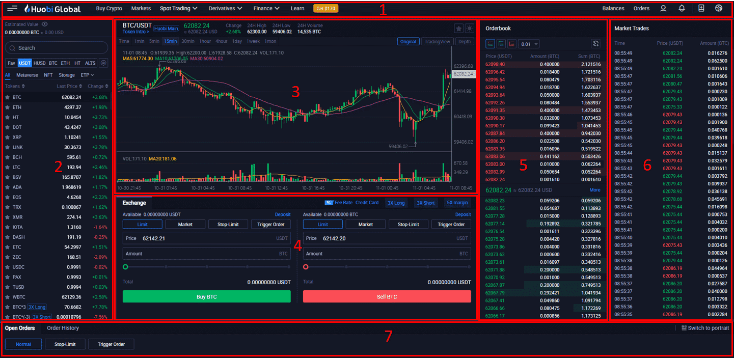 Po úspešnom nastavení účtu, verifikácii a vložení prvých prostriedkov môžeme prejsť na kapitolu obchodovania. Do tohto rozhrania sa dostanete vľavo hore cez možnosť Spot Trading. Práve tu si viete prepínať medzi klasickým a maržovým obchodovaním. Nasledujúci obrázok vám pomôže správne sa zorientovať v tomto rozhraní.