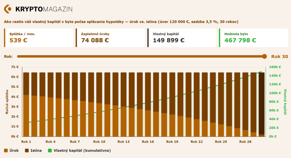 Parametre: kúpna cena 150 000 €, úver 120 000 € pri 80 % LTV, sadzba 3,5 % (realistický priemer pre FIX3), splatnosť 30 rokov, mesačné nájomné 700 €.
