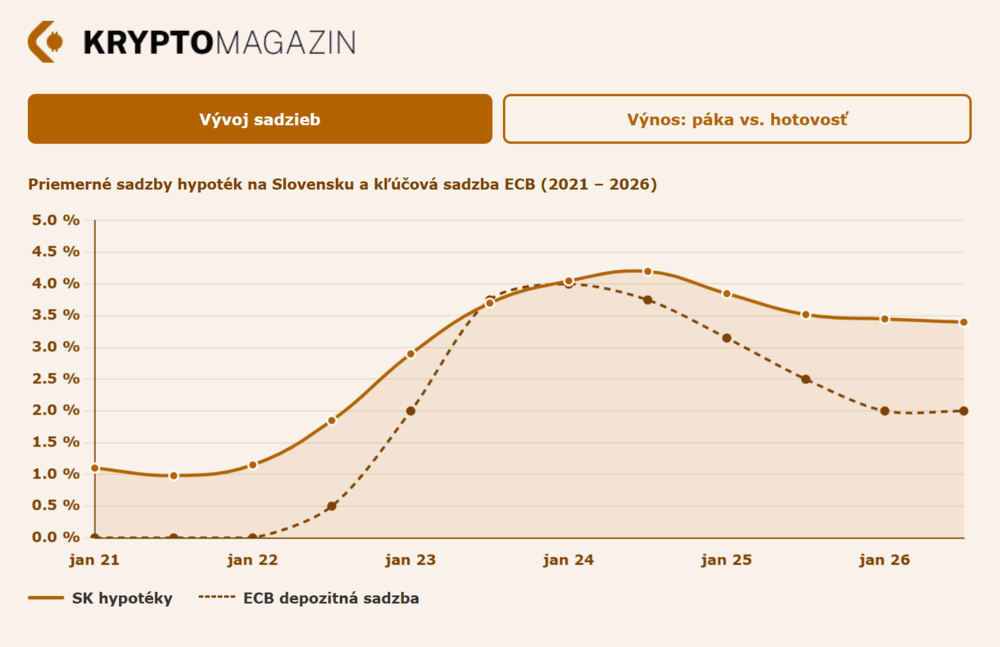 Ešte pred piatimi rokmi platila na Slovensku jednoduchá rovnica: kúpte byt na hypotéku, prenajmite ho a nájomníci vám mesačne zaplatia splátku. Pri sadzbách okolo 0,98 % v roku 2021 to fungovalo takmer mechanicky. Dnes sú sadzby trojnásobne vyššie, ceny bytov sú rekordné a mesačný cash flow z investičného bytu je v najlepšom prípade blízko nuly.
