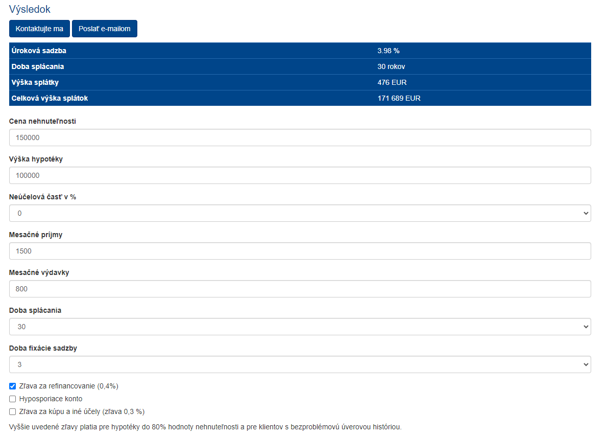 Úroková sadzba 3,98 % sa vzťahuje na dobu fixácie 1 a 3 roky. V prípade, že chcete fixáciu 5 rokov, sadzba stúpne na úroveň 4,18 %. Ak vezmete hypotéku 100 000 eur na nehnuteľnosť v hodnote 150 000 eur na 30 rokov s fixáciou 3 rokov, mesačná splátka bude 476 eur.