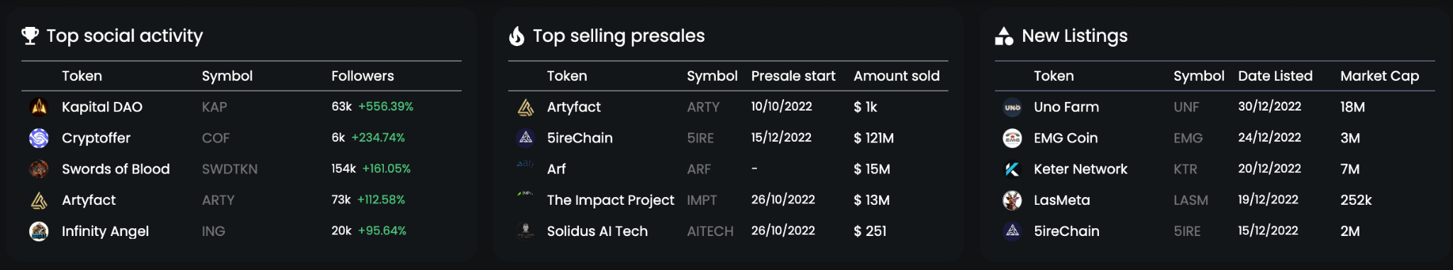 Sekcie ako napríklad „najlepšia sociálna aktivita”, „najlepšie predpredaje” a „nové listingy” poskytujú používateľom okamžitý prehľad o situácii na trhu tým, že zobrazujú 5 najlepších z nich.