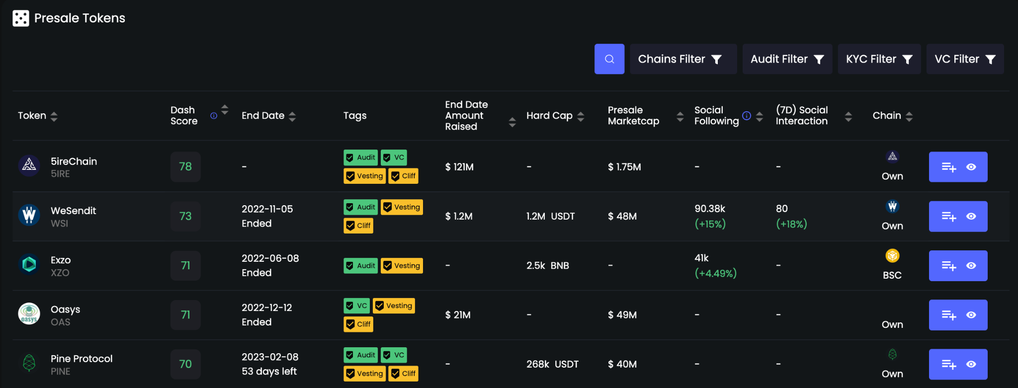 Informácie o každom tokene zahŕňajú Dash Score, dátum ukončenia, tagy, dátum uzávierky vyzbieranej sumy, pevný limit, trhový limit predpredaja, sociálne sledovanie, sociálne interakcie a reťazec.
