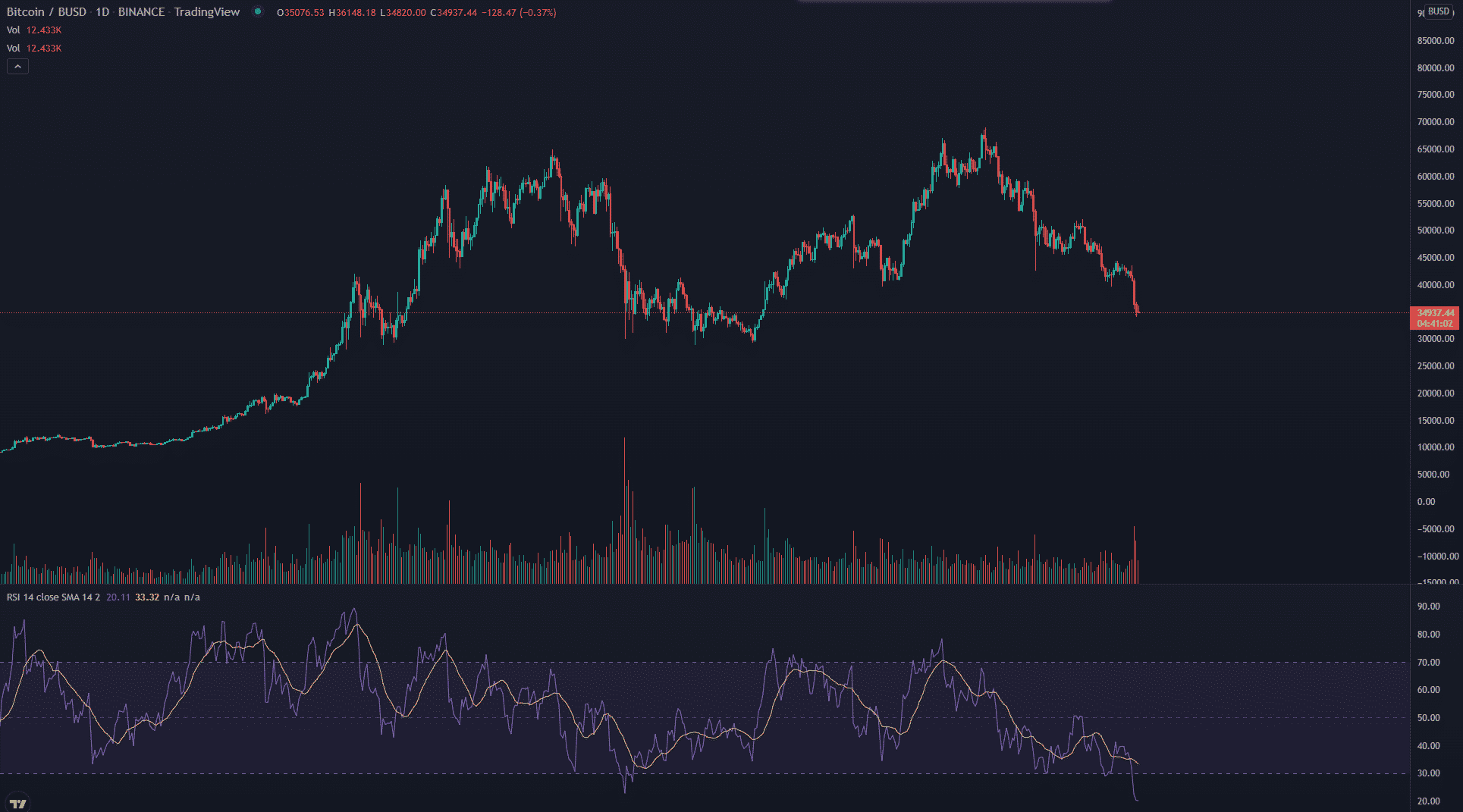 V marci 2020 sa hodnota RSI dostala pod hodnotu 25. Bitcoin takmer okamžite dosiahol lokálne maximum na úrovni 10 000 USD. Indikátor teda dokázal predpovedať krátkodobý zvrat, no jeho údaje nenaznačovali, že by sa BTC dostal na nové ATH.