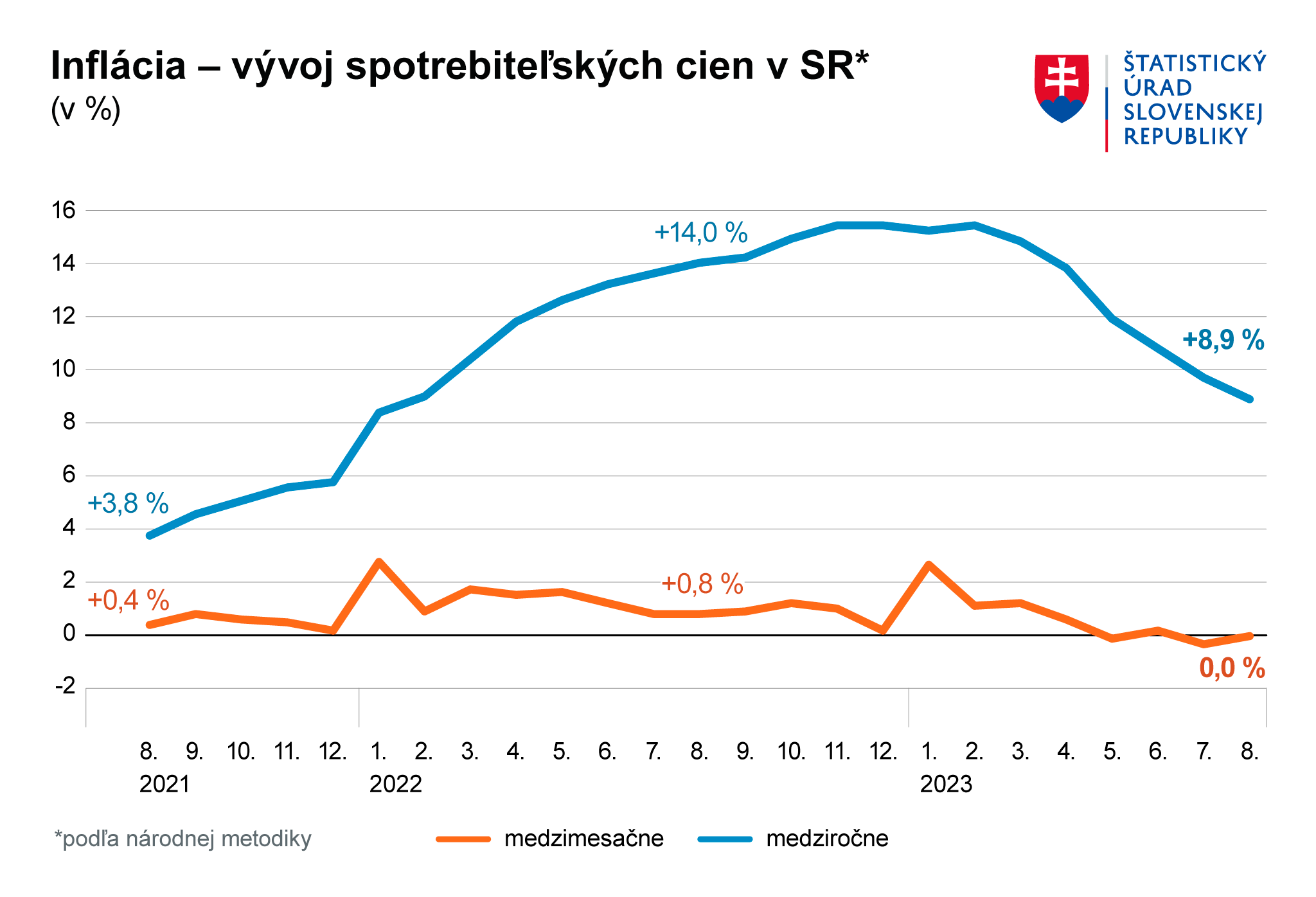 V medziročnom porovnaní s augustom 2022 sa inflácia znížila na hodnotu 8,9 %. Potraviny s nealkoholickými nápojmi a bývanie a energie zostávajú najvýznamnejšími faktormi, ktoré ovplyvňujú celkovú infláciu. Rast cien potravín spomaľoval už piaty mesiac po sebe, ale stále dosahoval hodnotu 13,6 %. Bývanie a energie zaznamenali pokles na 7,3 %.