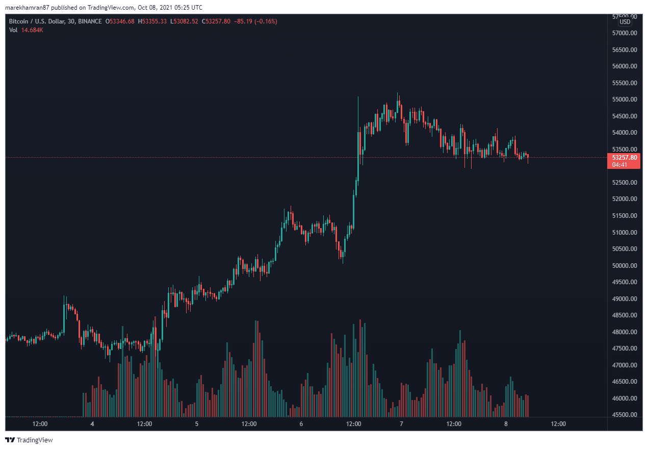 Bitcoin sa po 35 % raste usadil na hranici približne 53 700 USD, kde aktuálne konsoliduje. V každom prípade sa mu podarilo opäť získať trhovú kapitalizáciu na úrovni 1 bilióna USD. V čase písania tohto článka bola cena na páre BTC/USD na úrovni 53 260 USD.