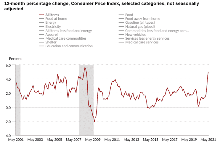 V máji vzrástol americký index spotrebiteľských cien o 0,6%. To predstavuje o 5% vyššiu hodnotu ako v máji minulého roka. Inflácia je aktuálne najvyššia od roku 2008.