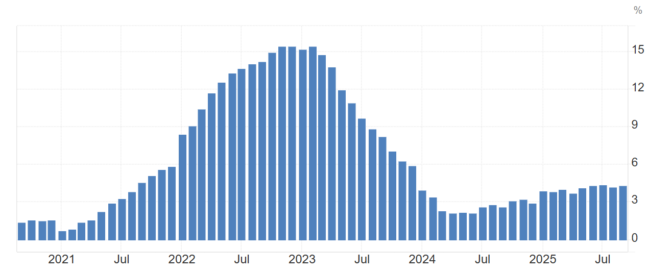 V roku 2025 dosahuje inflácia na Slovensku približne 4 %, pričom podľa údajov TradingEconomics za september 2025 bola na úrovni 4,3 %. To znamená, že ak máte 10 000 eur na účte, o rok bude mať ich reálna hodnota len 9 570 eur. Počas pandémie boli čísla ešte extrémnejšie. Inflácia v rokoch 2022 a 2023 presiahla 15 %, čo bolo historické maximum v modernej ére Slovenska.