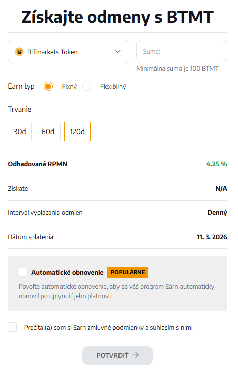 Tento produkt umožňuje získať ročný výnos až 4,25 % RPMN prostredníctvom programu BTMT Earn. Proces je jednoduchý: