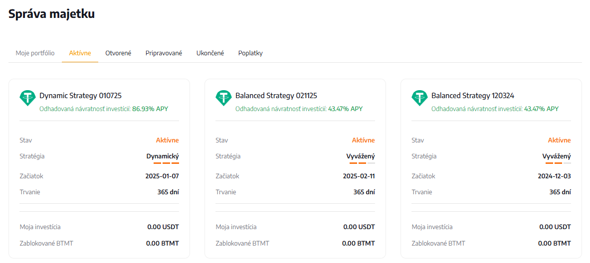 Staking BTMT tokenu je výborný spôsob, ako poraziť infláciu. No pre investorov, ktorí hľadajú vyšší výnos, existujú aj dynamickejšie riešenia. Jedným z nich je správa majetku na platforme BITmarkets, ktorá umožňuje získať až 86,93 % APY pri dynamickej stratégii fondu.