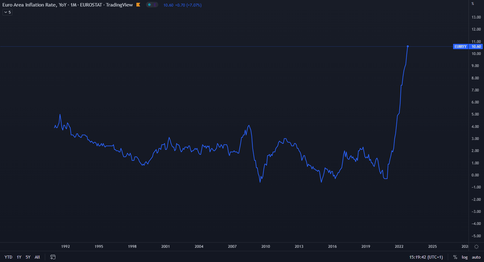 Ako vidíme na grafe nižšie, inflácia v 19 krajinách, ktoré používajú euro, dosiahla nový rekord 10,6 % minulý mesiac. Napriek tomu si ekonómovia v prieskume agentúry Reuters myslia, že inflácia začne ustupovať a klesne na úroveň 10,4 %. Rovnaký názor má aj viceprezident ECB Luis de Guindos, ktorý predpokladá, že inflácia sa aj naďalej bude v najbližších mesiacoch pohybovať v hladine 10 %.